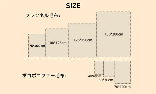ポコポコファー毛布:60×40 cm/180g,70×50 cm/210g,100×70 cm/420g