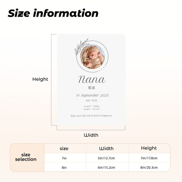 写真のように、お名前・誕生日・出生時の身長体重などをお入れすることができます。