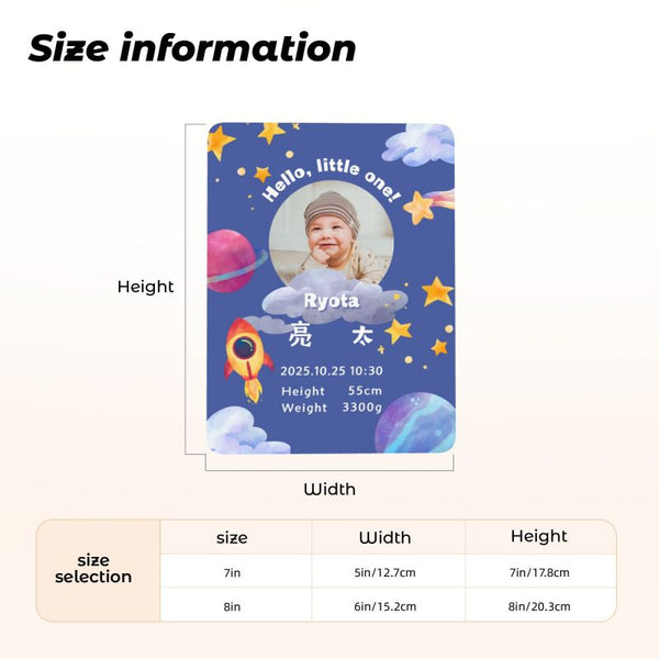 写真のように、お名前・誕生日・出生時の身長体重などをお入れすることができます。